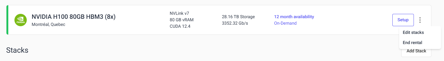 Click the ‘Kebab’ icon on the right side of the instance and select ‘End Rental’ when you are finished with your instance. This action will delete all your stacks and the resources and data within them, remove the instance from your account, and place it back in the GPU Trader inventory.