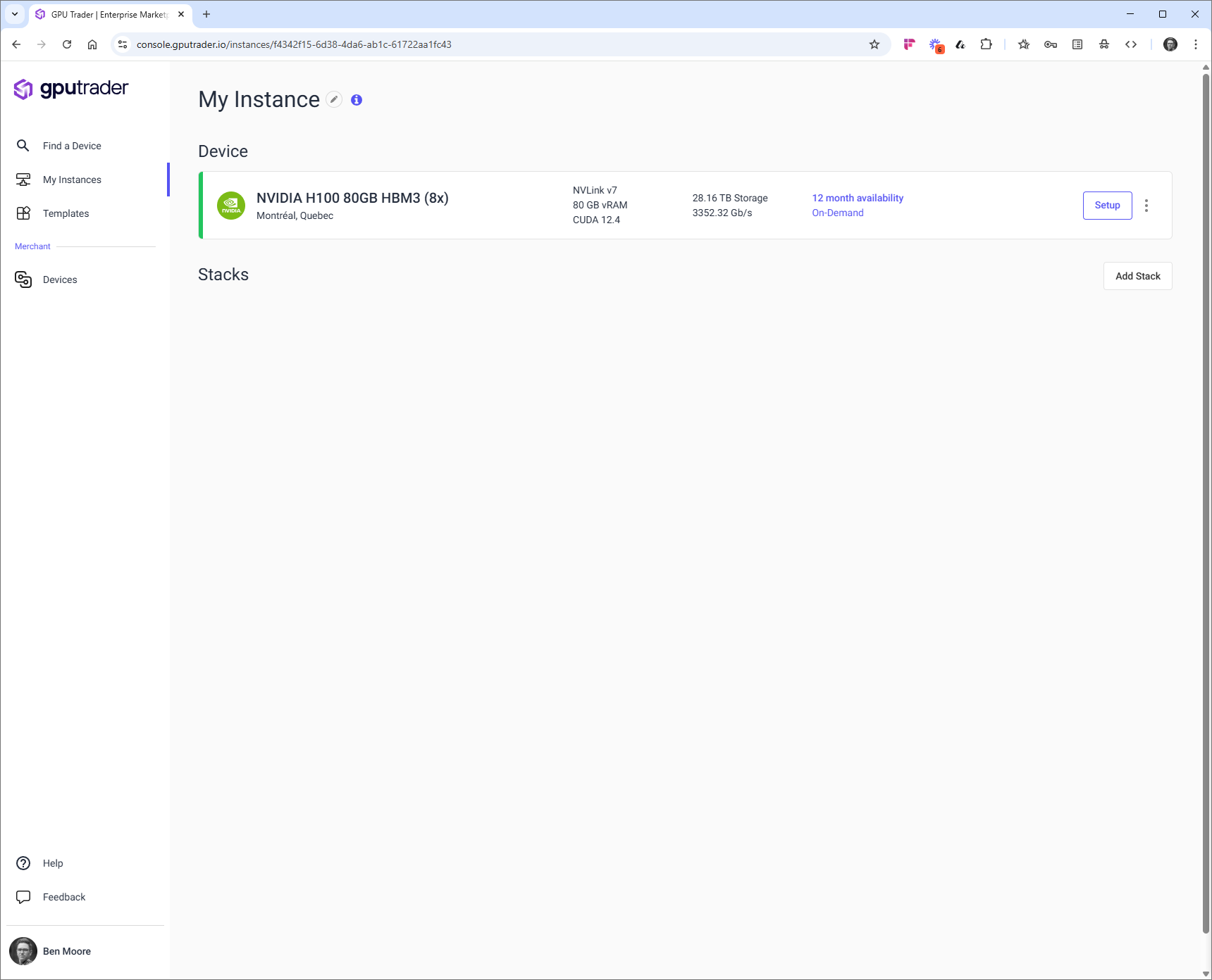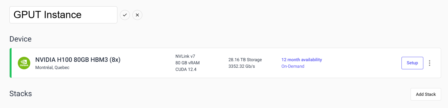The instance details page allows you to give your instance a custom name, see the instance status, add stacks, work with stacks that are running and end your rental.