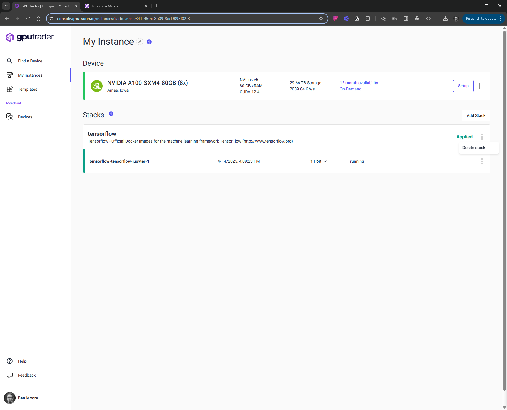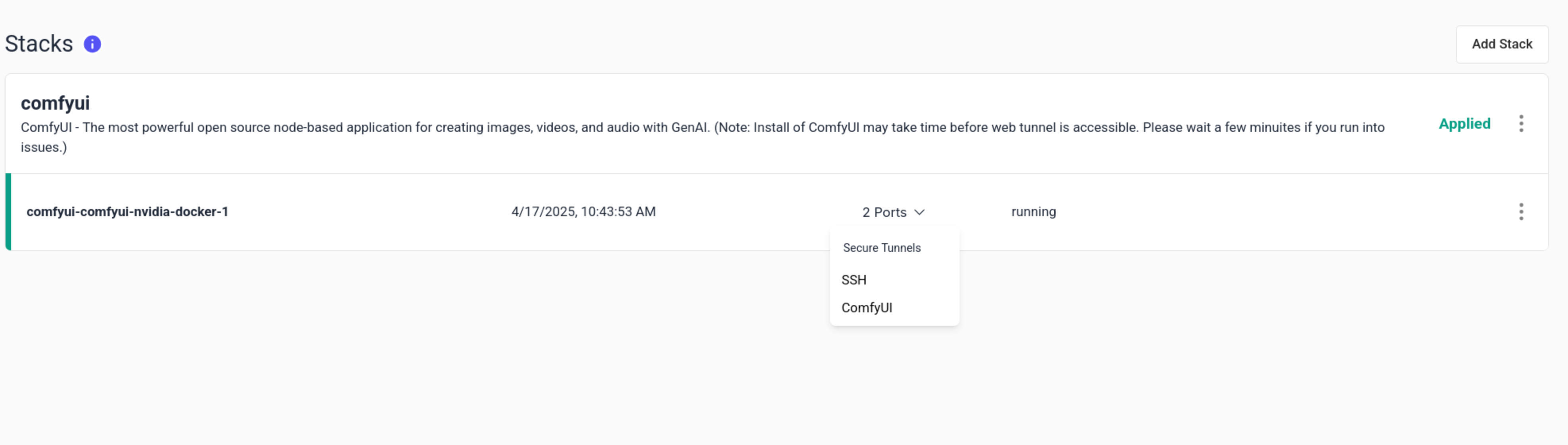 It is important to understand that there is no single way to use your instance. Much of how you use the instance will depend on what managed template you deployed or if you created your own template. This documentation will help you understand the basic controls in the GPU Trader interface.Stacks