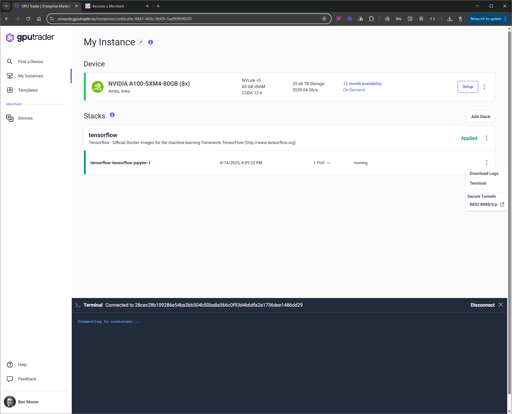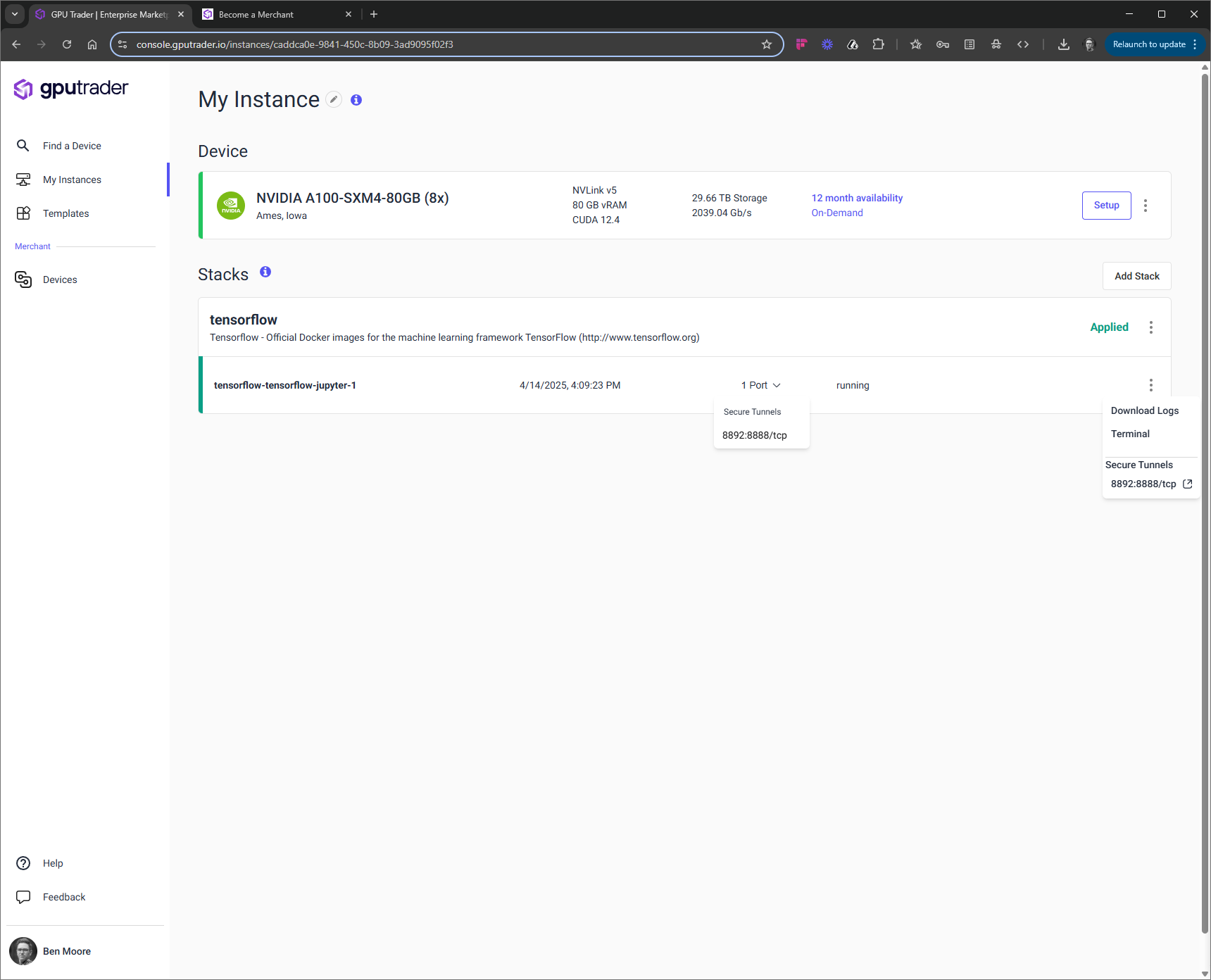 GPU Trader includes secure point to point connections via secure reverse tunnel. To use the secure tunnel you can either (1) click the ‘Kebab’ on the right and choose the port you wish to connect to, or (2) click the ‘Port’ dropdown on the card and choose the port you wish to connect to.